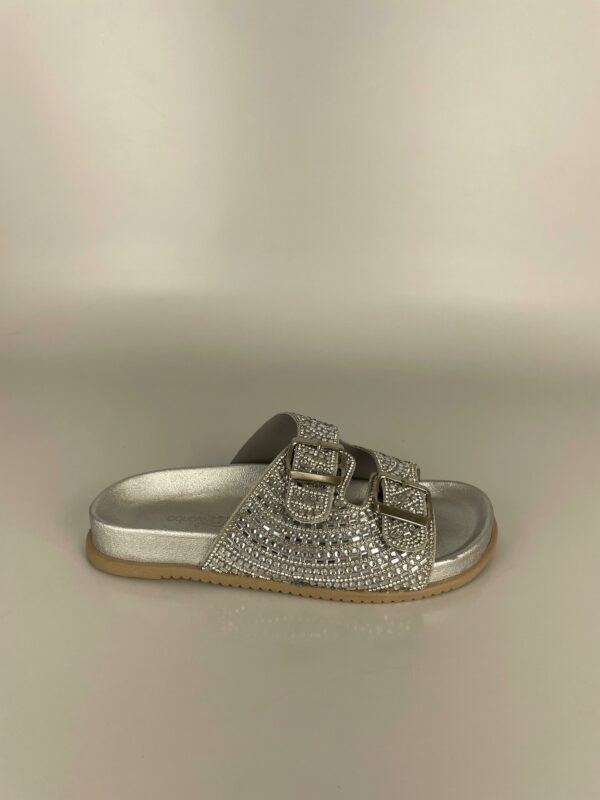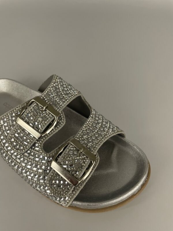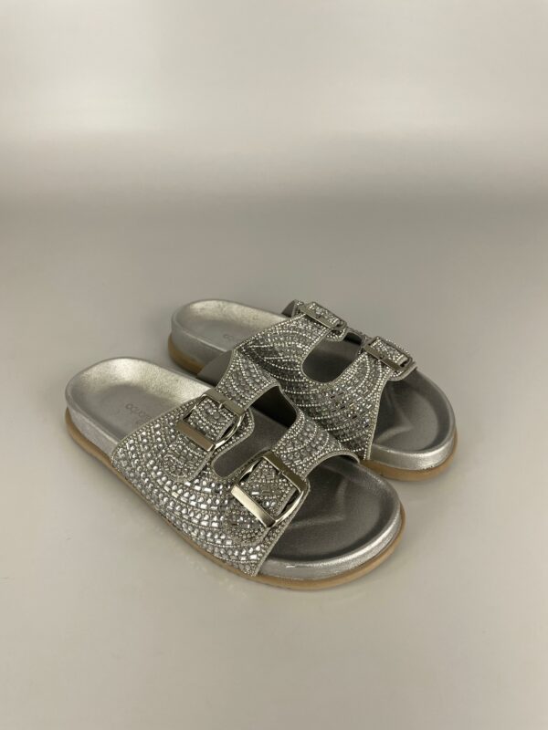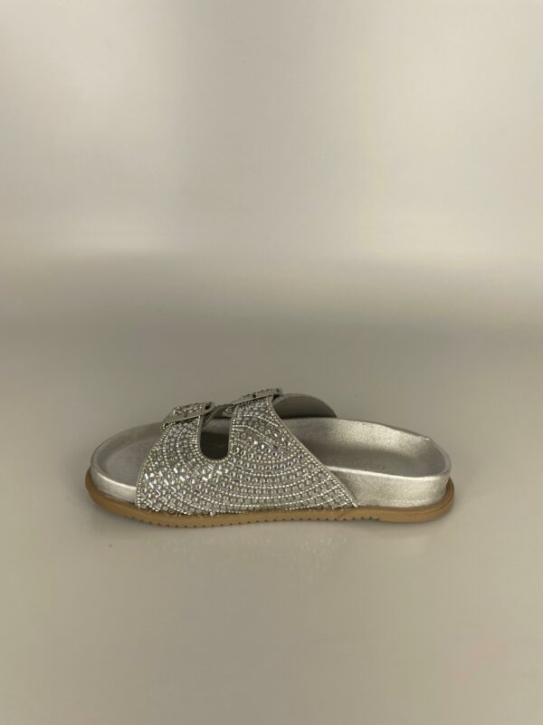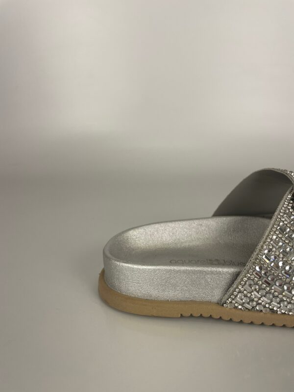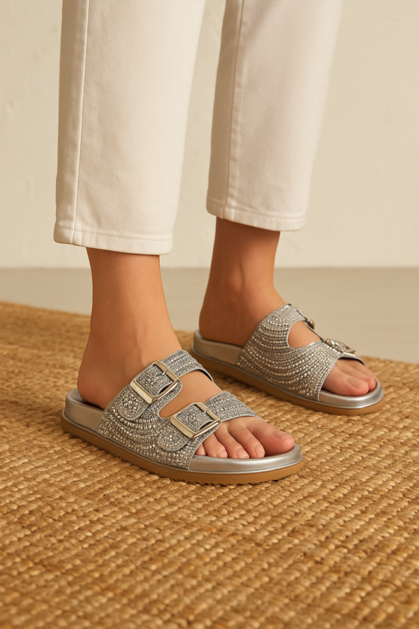 Descubra o charme atemporal do prateado com nossa papete de pedraria. Esta peça é a definição de elegância moderna, combinando o brilho frio da prata com um design clássico e confortável. As pedras reluzentes cobrem as tiras, transformando cada movimento em um espetáculo de luz. Versátil e sofisticada, esta sandália é perfeita para qualquer ocasião, do dia à noite. Adicione um toque de brilho sutil e contemporâneo ao seu estilo.