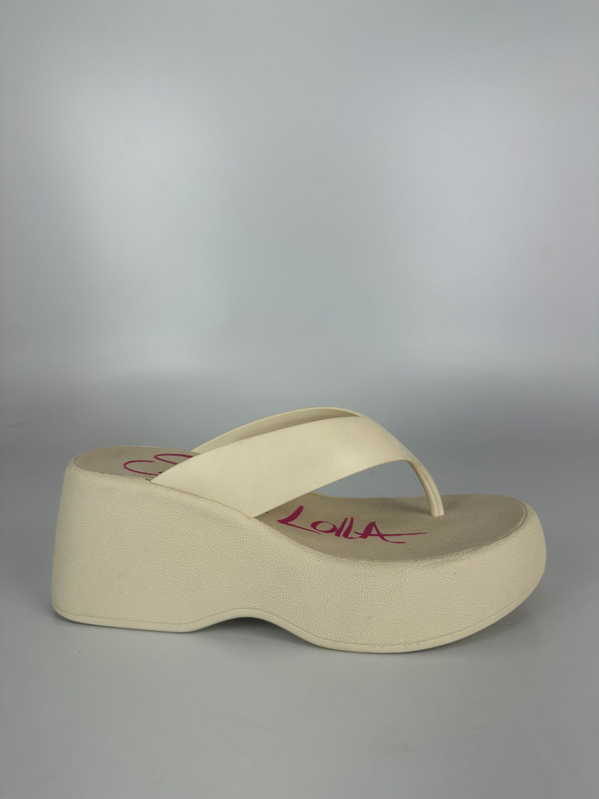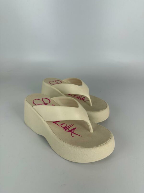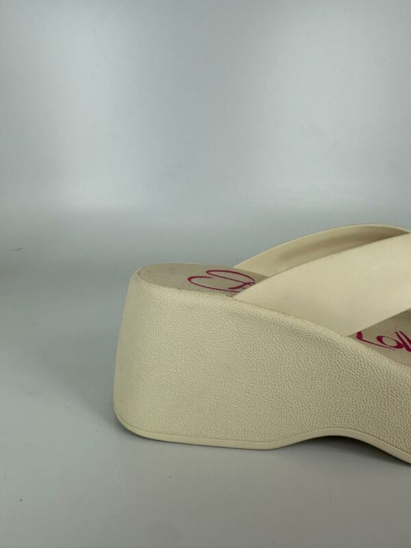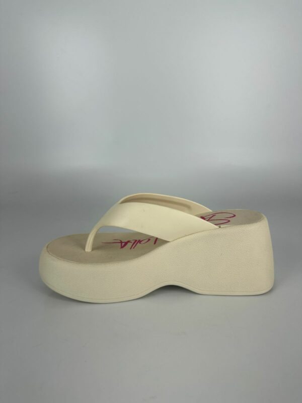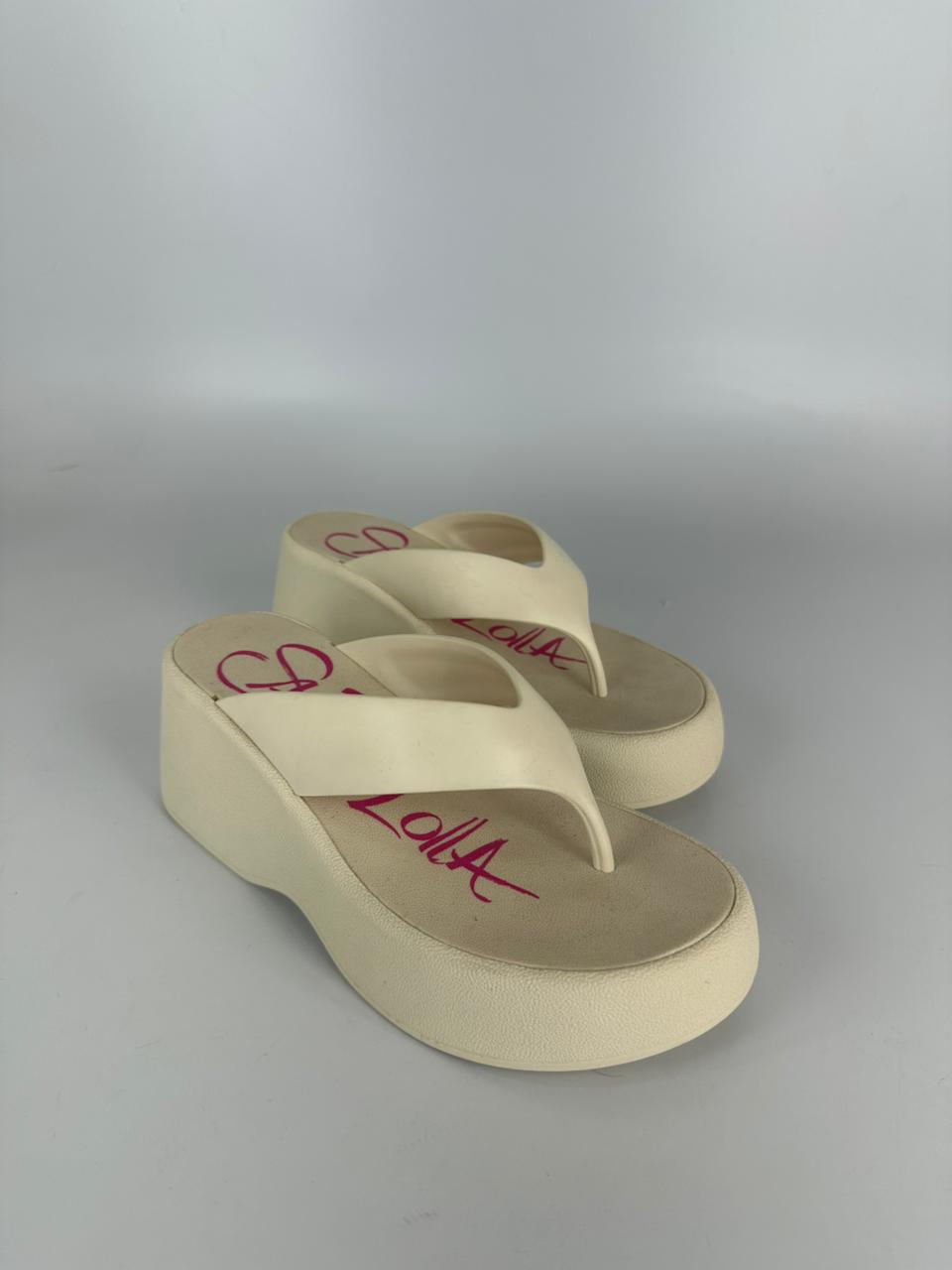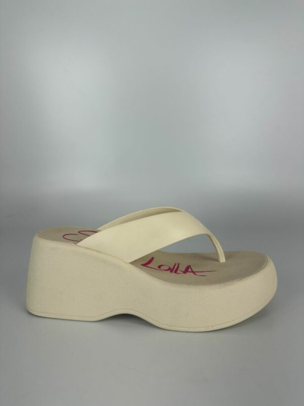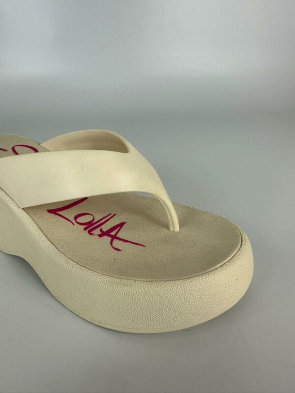 Sandália plataforma, confeccionada em borracha. Possui sola alta e espessa, tira larga que passa sobre o peito do pé e uma alça que separa o dedão dos demais dedos, oferecendo estabilidade e firmeza ao caminhar. O modelo possui um formato anatômico, com a parte frontal mais baixa que a traseira, criando uma inclinação suave para maior conforto. Esse tipo de calçado é ideal para looks despojados e casuais, especialmente em dias quentes ou em ambientes mais descontraídos. A escolha do material em borracha contribui para a leveza e praticidade, sendo fácil de limpar e resistente à água.