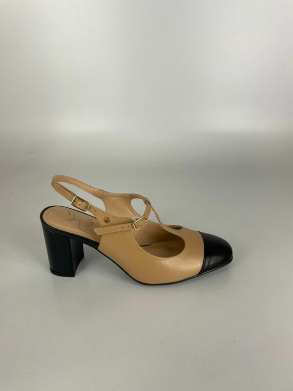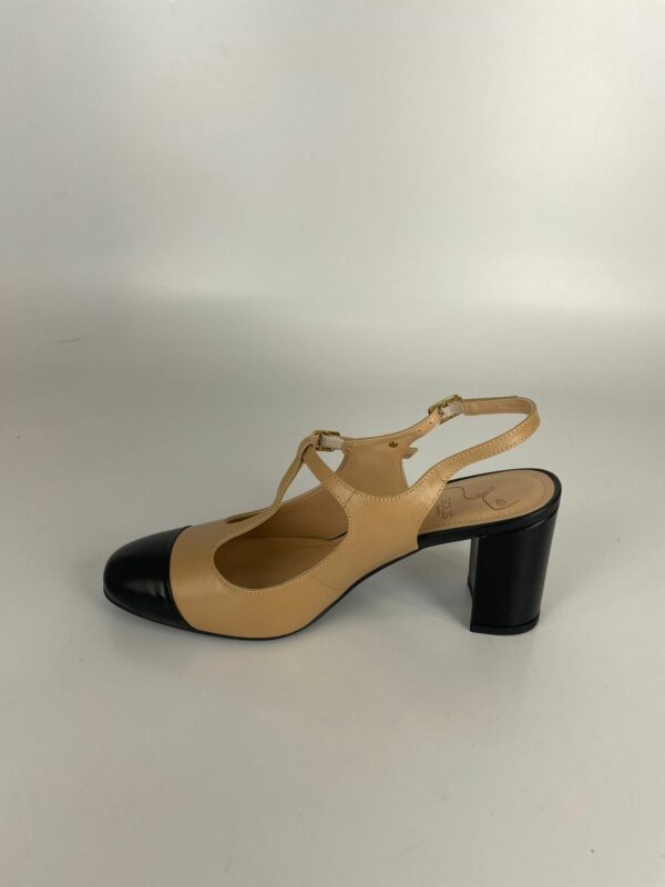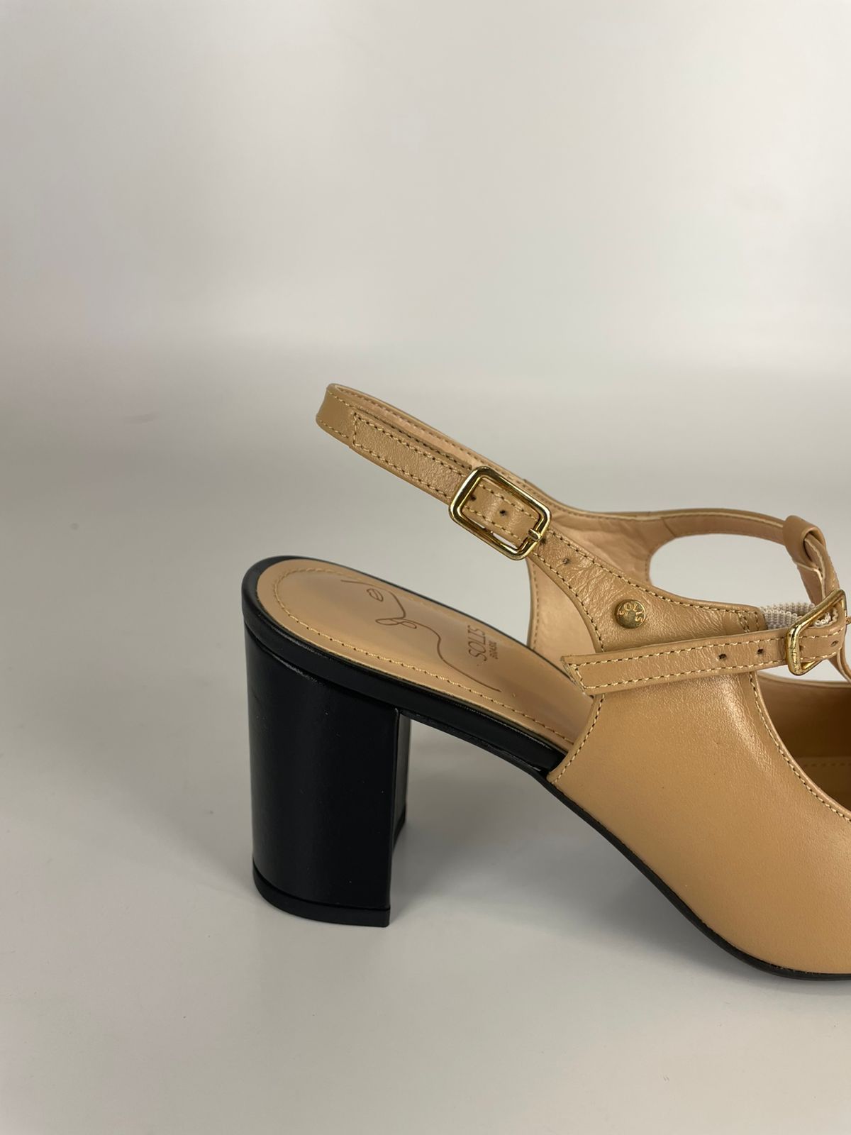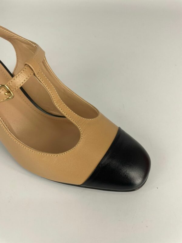 Solis Sapato Bicolor Salto Bloco Couro Caramelo E Preto